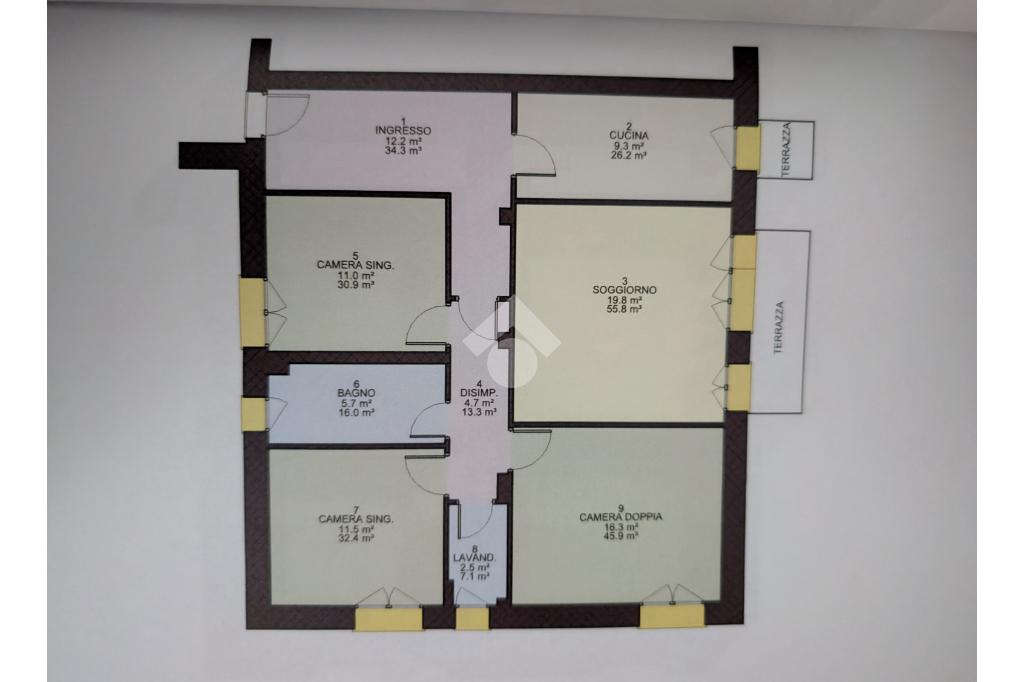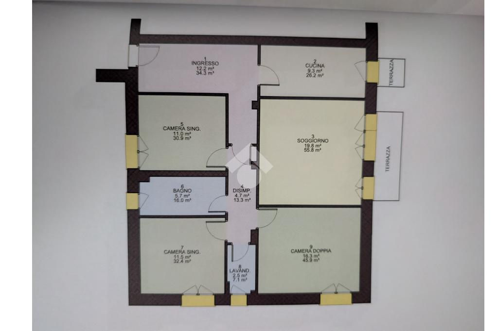 Attraverso l'ampio ingresso si accede alla zona giorno composta da soggiorno con cucina separata, entrambi con accesso ai due terrazzi.