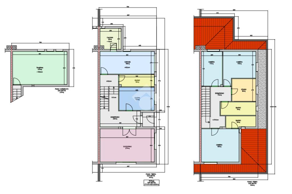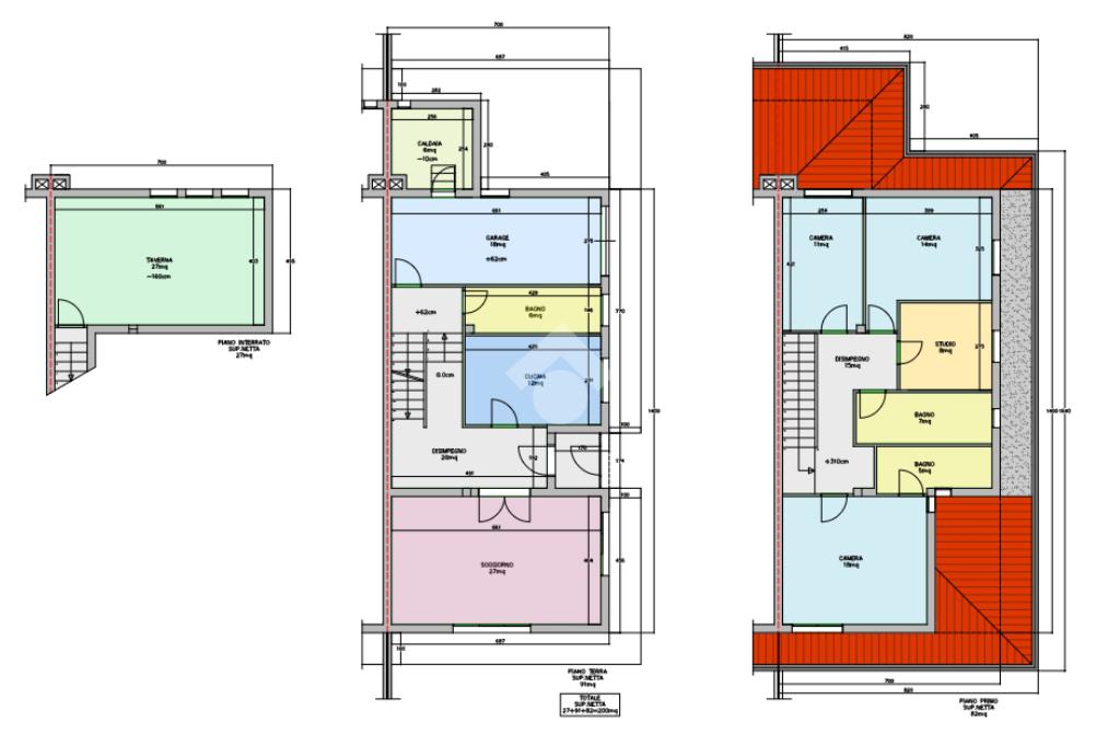 Al primo piano troviamo tre camere, di cui la camera padronale con bagno in camera finestrato e con vasca, una camera matrimoniale, una camera singola, uno studio e un bagno finestrato con vasca a servizio del primo piano.